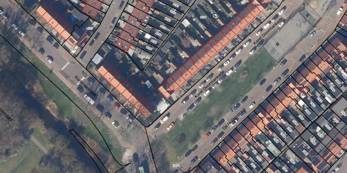 Het perceel waarop Karel Doormankade 31 staat heeft een oppervlakte van 4677 m². Dit is een zeer groot perceel. De perceeloppervlakte wordt geregistreerd door het Kadaster. Gedetailleerde informatie over de maten van dit perceel kunt u vinden in het rapport Kadastrale kaart met maatvoering van Karel Doormankade 31.