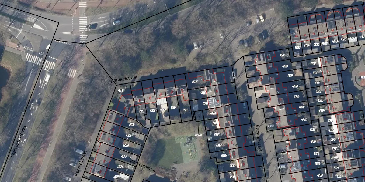 Het perceel waarop Karveelstraat 103 staat heeft een oppervlakte van 162 m². Dit is een middelgroot perceel. De perceeloppervlakte wordt geregistreerd door het Kadaster. Gedetailleerde informatie over de maten van dit perceel kunt u vinden in het rapport Kadastrale kaart met maatvoering van Karveelstraat 103.