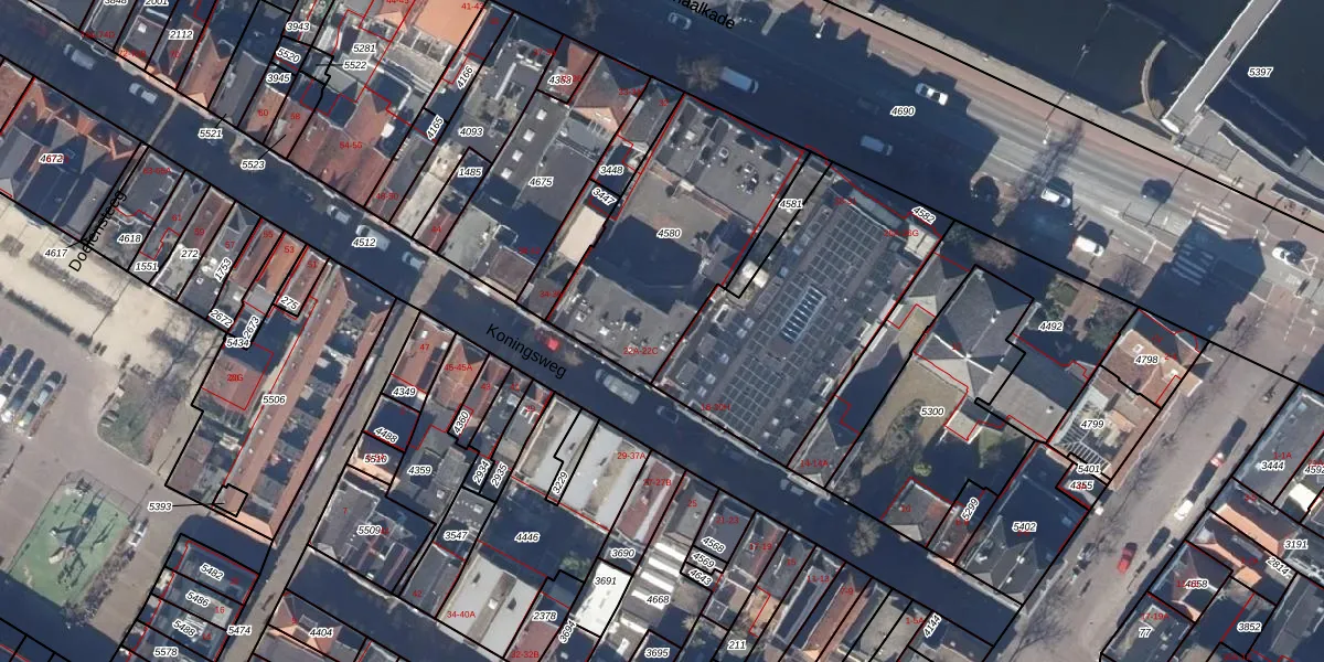 Het perceel waarop Koningsweg 18-F staat heeft een oppervlakte van 856 m². Dit is een groot perceel. De perceeloppervlakte wordt geregistreerd door het Kadaster. Gedetailleerde informatie over de maten van dit perceel kunt u vinden in het rapport Kadastrale kaart met maatvoering van Koningsweg 18-F.