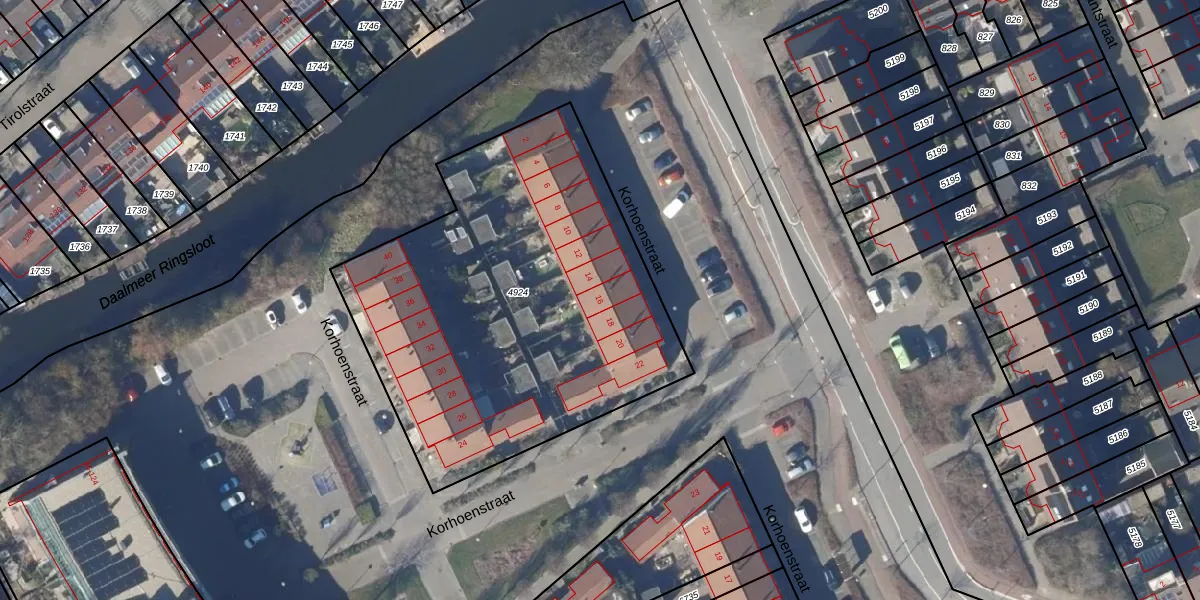 Het perceel waarop Korhoenstraat 16 staat heeft een oppervlakte van 2184 m². Dit is een zeer groot perceel. De perceeloppervlakte wordt geregistreerd door het Kadaster. Gedetailleerde informatie over de maten van dit perceel kunt u vinden in het rapport Kadastrale kaart met maatvoering van Korhoenstraat 16.