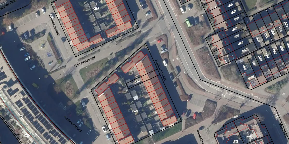 Het perceel waarop Korhoenstraat 19 staat heeft een oppervlakte van 2426 m². Dit is een zeer groot perceel. De perceeloppervlakte wordt geregistreerd door het Kadaster. Gedetailleerde informatie over de maten van dit perceel kunt u vinden in het rapport Kadastrale kaart met maatvoering van Korhoenstraat 19.
