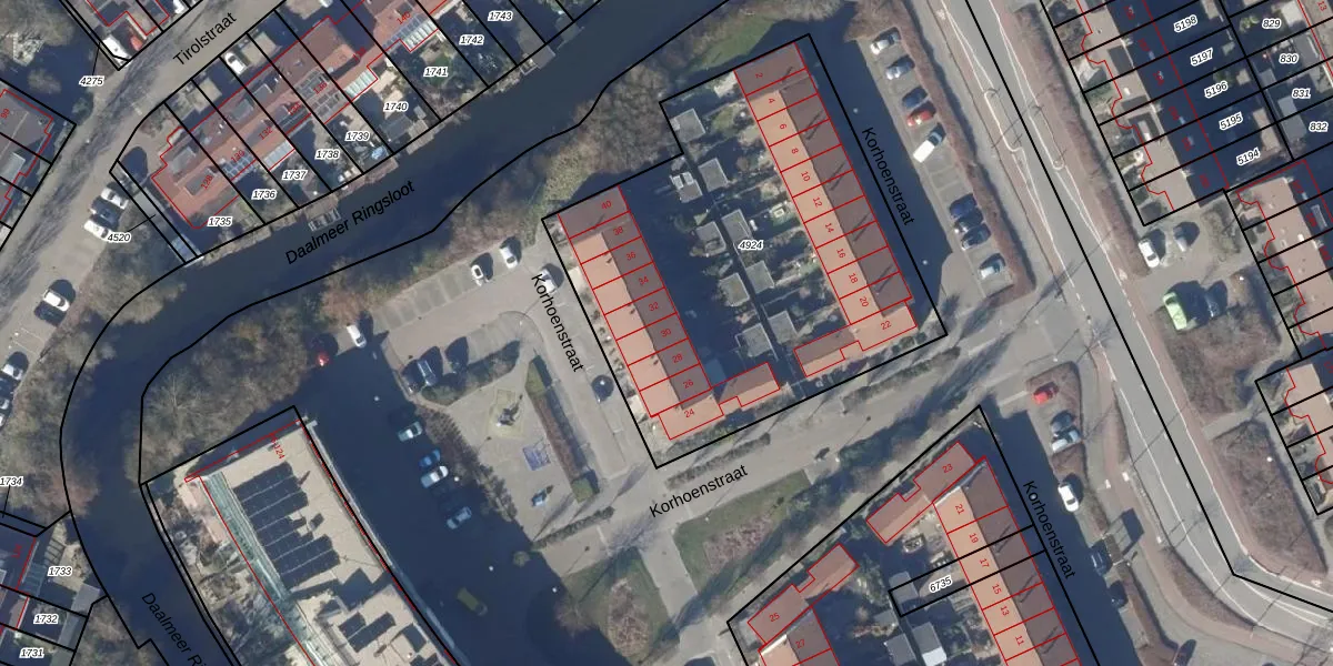 Het perceel waarop Korhoenstraat 30 staat heeft een oppervlakte van 2184 m². Dit is een zeer groot perceel. De perceeloppervlakte wordt geregistreerd door het Kadaster. Gedetailleerde informatie over de maten van dit perceel kunt u vinden in het rapport Kadastrale kaart met maatvoering van Korhoenstraat 30.