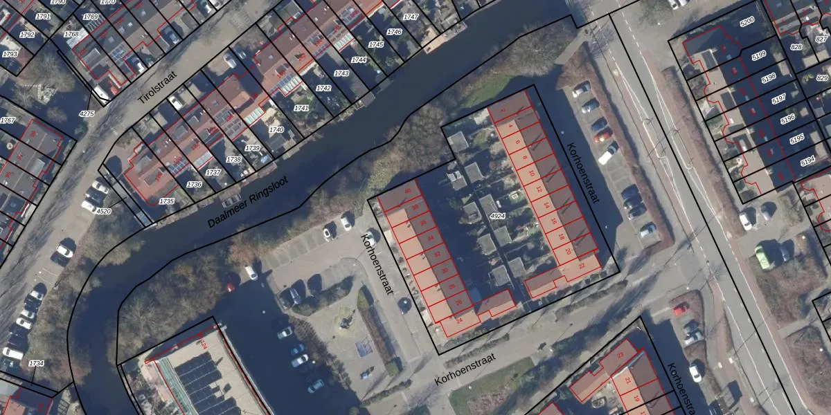 Het perceel waarop Korhoenstraat 38 staat heeft een oppervlakte van 2184 m². Dit is een zeer groot perceel. De perceeloppervlakte wordt geregistreerd door het Kadaster. Gedetailleerde informatie over de maten van dit perceel kunt u vinden in het rapport Kadastrale kaart met maatvoering van Korhoenstraat 38.