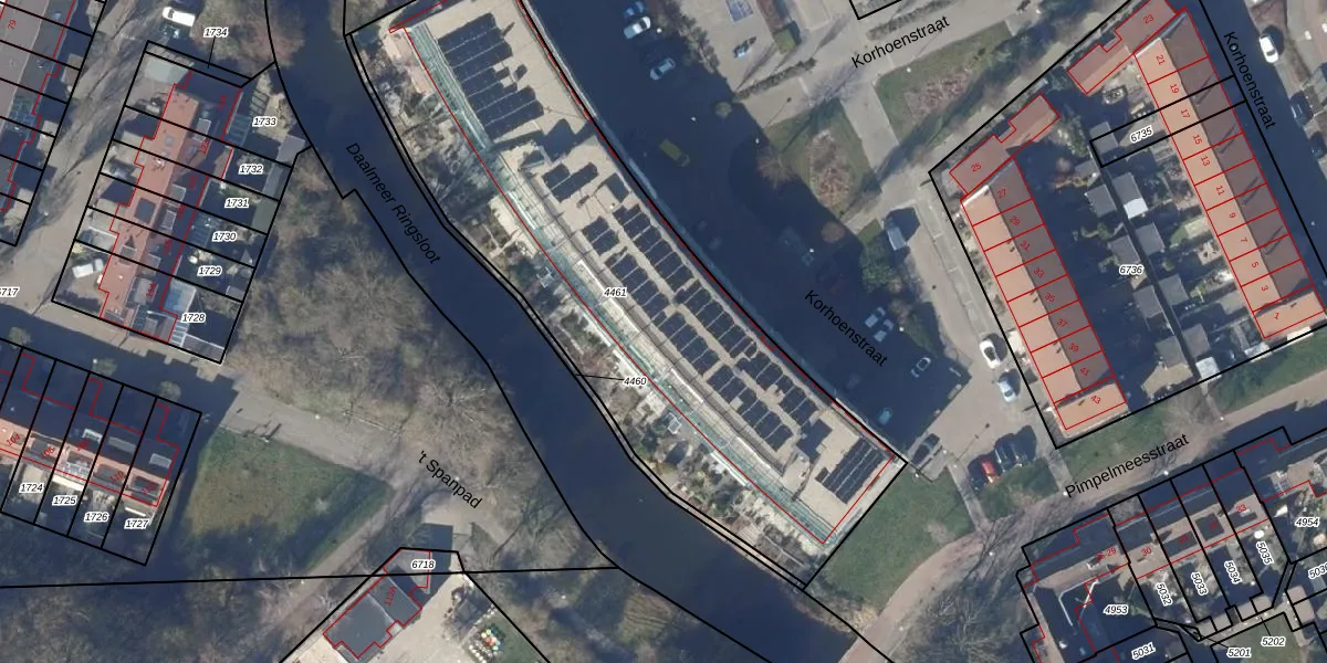 Het perceel waarop Korhoenstraat 57 staat heeft een oppervlakte van 2655 m². Dit is een zeer groot perceel. De perceeloppervlakte wordt geregistreerd door het Kadaster. Gedetailleerde informatie over de maten van dit perceel kunt u vinden in het rapport Kadastrale kaart met maatvoering van Korhoenstraat 57.
