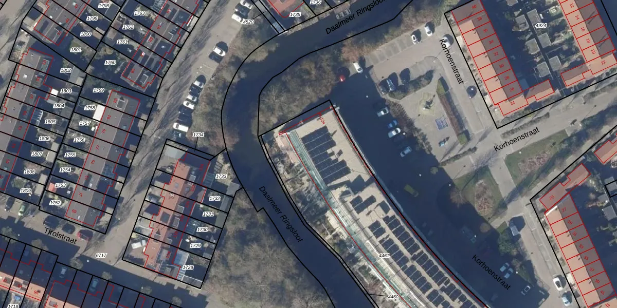 Het perceel waarop Korhoenstraat 77 staat heeft een oppervlakte van 2655 m². Dit is een zeer groot perceel. De perceeloppervlakte wordt geregistreerd door het Kadaster. Gedetailleerde informatie over de maten van dit perceel kunt u vinden in het rapport Kadastrale kaart met maatvoering van Korhoenstraat 77.