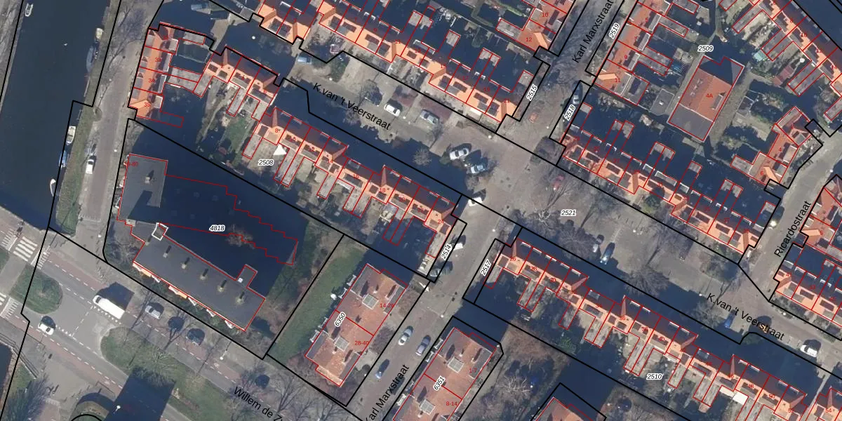Het perceel waarop K.van 't Veerstraat 22 staat heeft een oppervlakte van 1935 m². Dit is een zeer groot perceel. De perceeloppervlakte wordt geregistreerd door het Kadaster. Gedetailleerde informatie over de maten van dit perceel kunt u vinden in het rapport Kadastrale kaart met maatvoering van K.van 't Veerstraat 22.