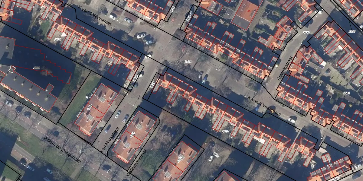 Het perceel waarop K.van 't Veerstraat 30 staat heeft een oppervlakte van 2560 m². Dit is een zeer groot perceel. De perceeloppervlakte wordt geregistreerd door het Kadaster. Gedetailleerde informatie over de maten van dit perceel kunt u vinden in het rapport Kadastrale kaart met maatvoering van K.van 't Veerstraat 30.
