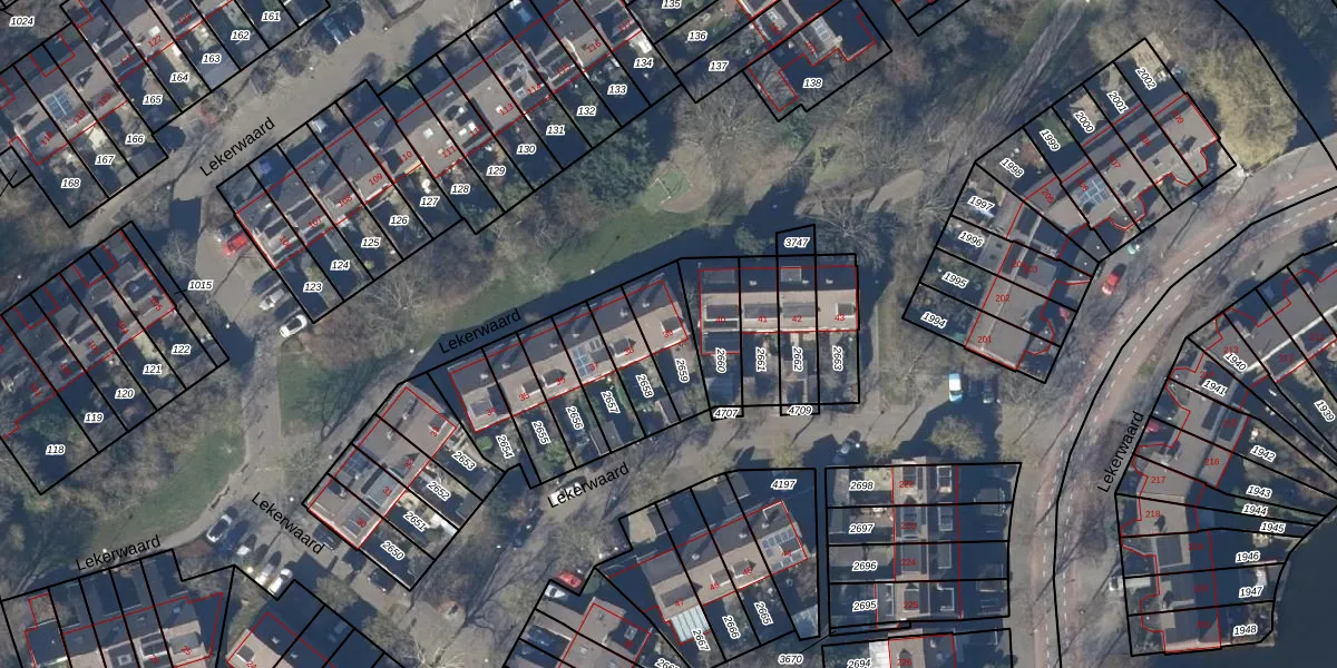 Het perceel waarop Lekerwaard 39 staat heeft een oppervlakte van 156 m². Dit is een middelgroot perceel. De perceeloppervlakte wordt geregistreerd door het Kadaster. Gedetailleerde informatie over de maten van dit perceel kunt u vinden in het rapport Kadastrale kaart met maatvoering van Lekerwaard 39.
