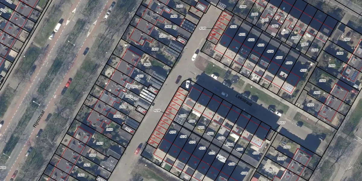Lekstraat 15-A is gelegen op kadastraal perceel ODP02A4158. Deze kadastrale aanduiding is uniek en wordt gebruikt door het Kadaster om eigendomsrechten en andere zakelijke rechten vast te leggen. Het perceel maakt onderdeel uit van de kadastrale gemeente Oudorp.