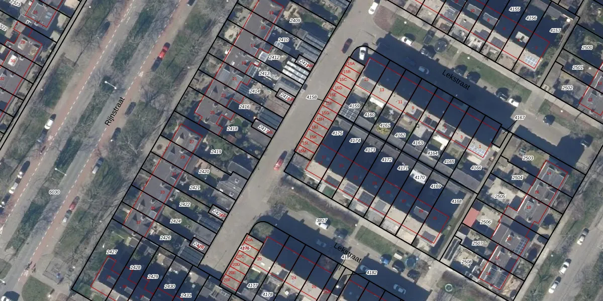 Lekstraat 15-M is gelegen op kadastraal perceel ODP02A4158. Deze kadastrale aanduiding is uniek en wordt gebruikt door het Kadaster om eigendomsrechten en andere zakelijke rechten vast te leggen. Het perceel maakt onderdeel uit van de kadastrale gemeente Oudorp.
