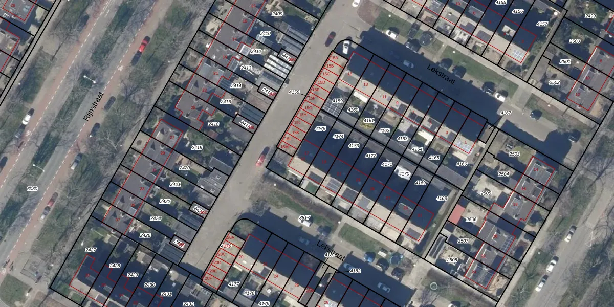 Lekstraat 17 is gelegen op kadastraal perceel ODP02A4175. Deze kadastrale aanduiding is uniek en wordt gebruikt door het Kadaster om eigendomsrechten en andere zakelijke rechten vast te leggen. Het perceel maakt onderdeel uit van de kadastrale gemeente Oudorp.