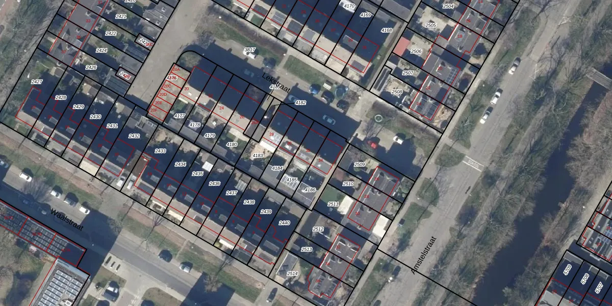 Lekstraat 32 is gelegen op kadastraal perceel ODP02A4185. Deze kadastrale aanduiding is uniek en wordt gebruikt door het Kadaster om eigendomsrechten en andere zakelijke rechten vast te leggen. Het perceel maakt onderdeel uit van de kadastrale gemeente Oudorp.