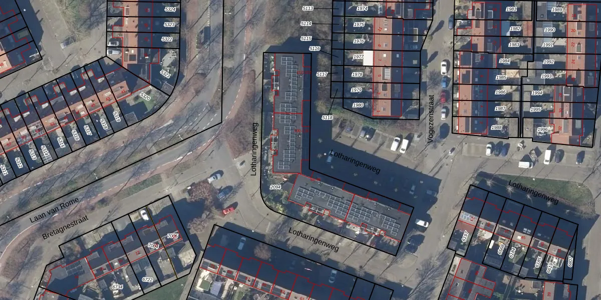 Het perceel waarop Lotharingenweg 104 staat heeft een oppervlakte van 1449 m². Dit is een zeer groot perceel. De perceeloppervlakte wordt geregistreerd door het Kadaster. Gedetailleerde informatie over de maten van dit perceel kunt u vinden in het rapport Kadastrale kaart met maatvoering van Lotharingenweg 104.