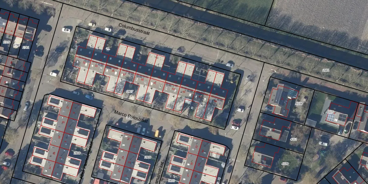 Het perceel waarop Marco Polostraat 45 staat heeft een oppervlakte van 2914 m². Dit is een zeer groot perceel. De perceeloppervlakte wordt geregistreerd door het Kadaster. Gedetailleerde informatie over de maten van dit perceel kunt u vinden in het rapport Kadastrale kaart met maatvoering van Marco Polostraat 45.