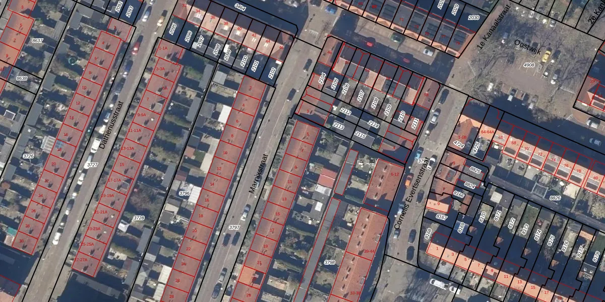 Het perceel waarop Marnixstraat 7 staat heeft een oppervlakte van 4565 m². Dit is een zeer groot perceel. De perceeloppervlakte wordt geregistreerd door het Kadaster. Gedetailleerde informatie over de maten van dit perceel kunt u vinden in het rapport Kadastrale kaart met maatvoering van Marnixstraat 7.