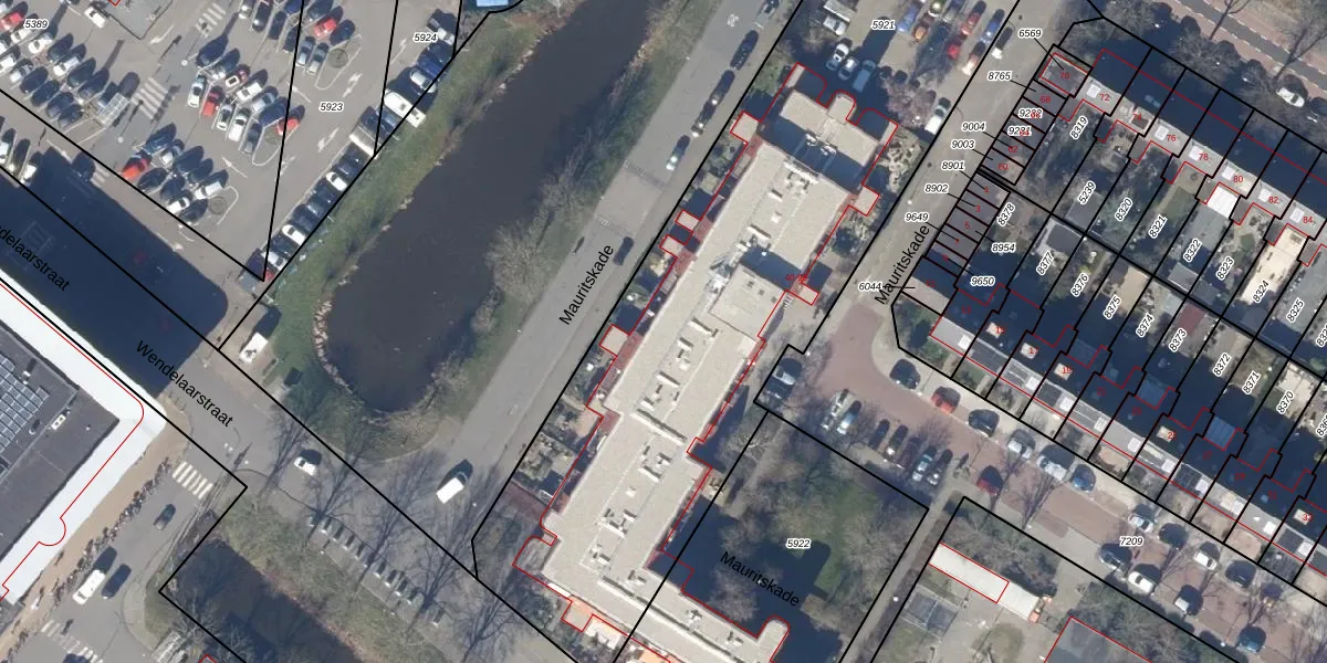 Het perceel waarop Mauritskade 64 staat heeft een oppervlakte van 3425 m². Dit is een zeer groot perceel. De perceeloppervlakte wordt geregistreerd door het Kadaster. Gedetailleerde informatie over de maten van dit perceel kunt u vinden in het rapport Kadastrale kaart met maatvoering van Mauritskade 64.