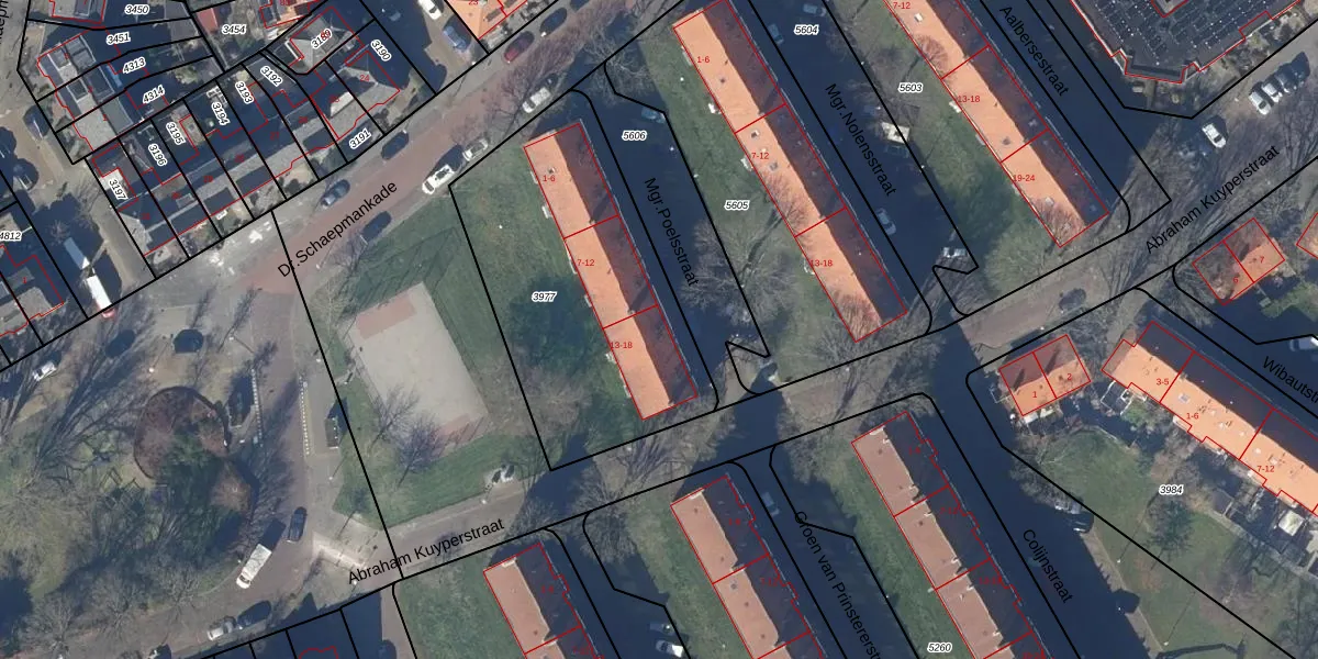 Het perceel waarop Mgr.Poelsstraat 15 staat heeft een oppervlakte van 1300 m². Dit is een zeer groot perceel. De perceeloppervlakte wordt geregistreerd door het Kadaster. Gedetailleerde informatie over de maten van dit perceel kunt u vinden in het rapport Kadastrale kaart met maatvoering van Mgr.Poelsstraat 15.
