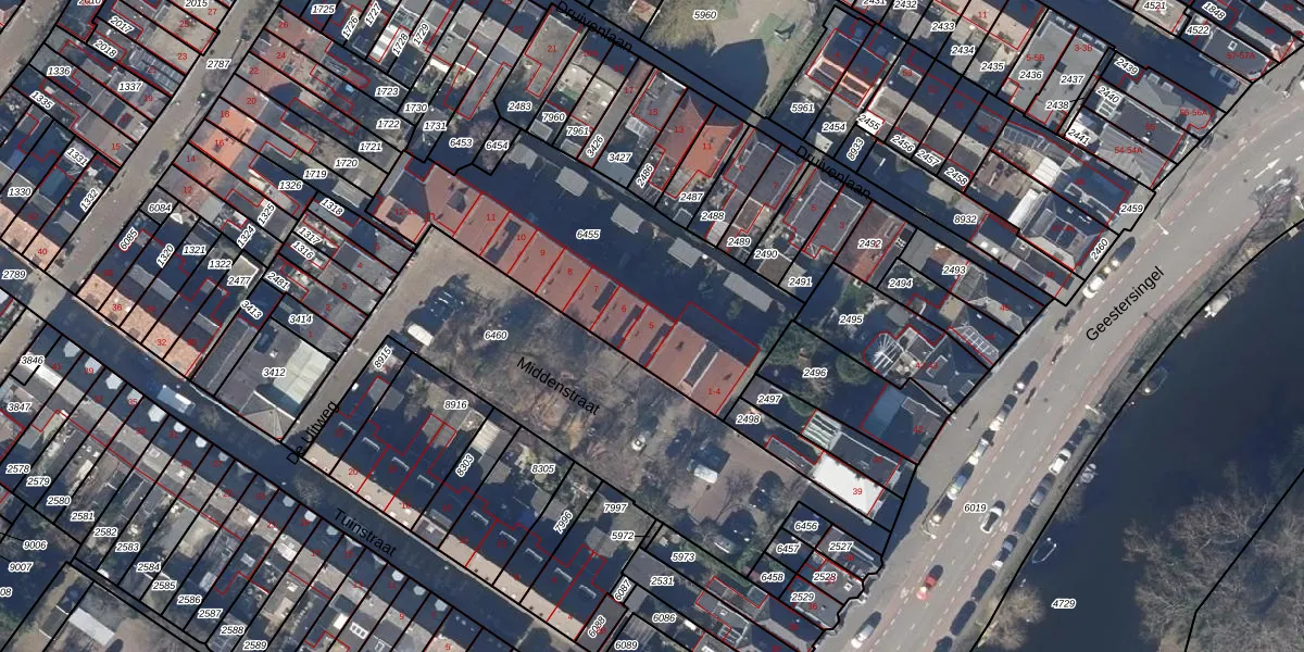 Het perceel waarop Middenstraat 5 staat heeft een oppervlakte van 1222 m². Dit is een zeer groot perceel. De perceeloppervlakte wordt geregistreerd door het Kadaster. Gedetailleerde informatie over de maten van dit perceel kunt u vinden in het rapport Kadastrale kaart met maatvoering van Middenstraat 5.