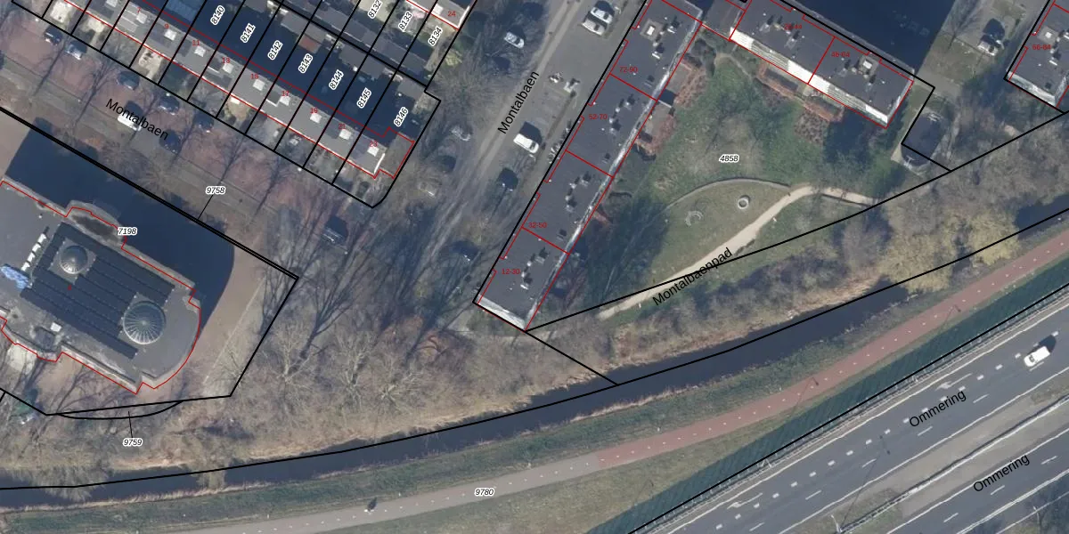 Het perceel waarop Montalbaen 20 staat heeft een oppervlakte van 3229 m². Dit is een zeer groot perceel. De perceeloppervlakte wordt geregistreerd door het Kadaster. Gedetailleerde informatie over de maten van dit perceel kunt u vinden in het rapport Kadastrale kaart met maatvoering van Montalbaen 20.