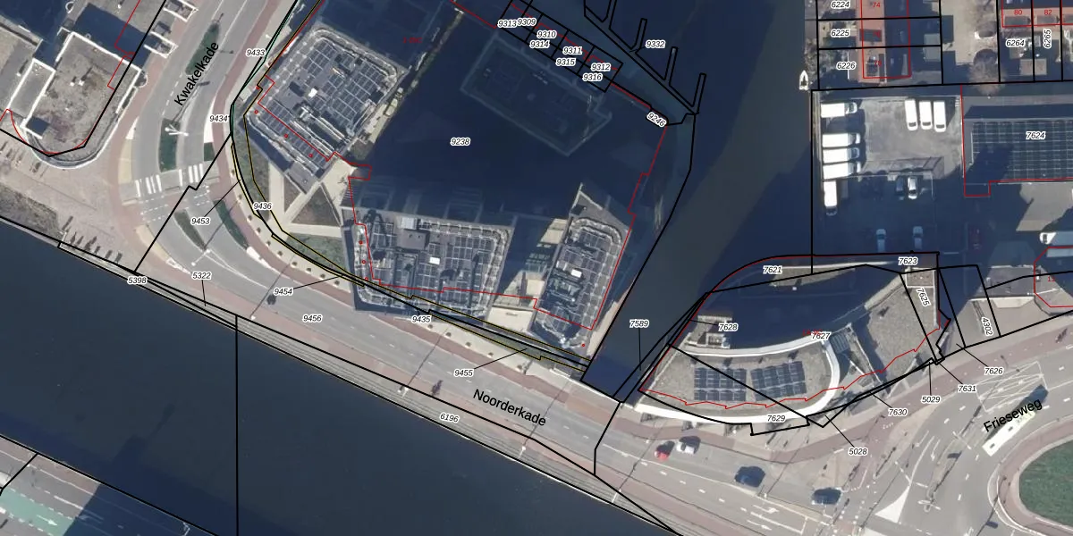Het perceel waarop Noorderkade 2-F staat heeft een oppervlakte van 4333 m². Dit is een zeer groot perceel. De perceeloppervlakte wordt geregistreerd door het Kadaster. Gedetailleerde informatie over de maten van dit perceel kunt u vinden in het rapport Kadastrale kaart met maatvoering van Noorderkade 2-F.