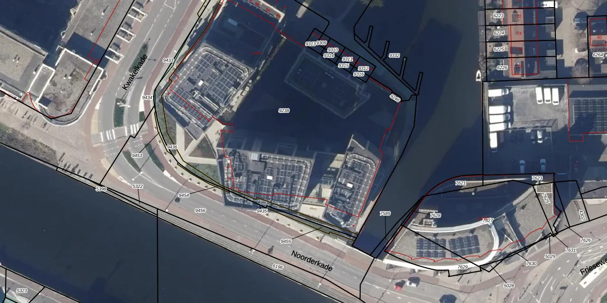 Het perceel waarop Noorderkade 5-C staat heeft een oppervlakte van 4333 m². Dit is een zeer groot perceel. De perceeloppervlakte wordt geregistreerd door het Kadaster. Gedetailleerde informatie over de maten van dit perceel kunt u vinden in het rapport Kadastrale kaart met maatvoering van Noorderkade 5-C.