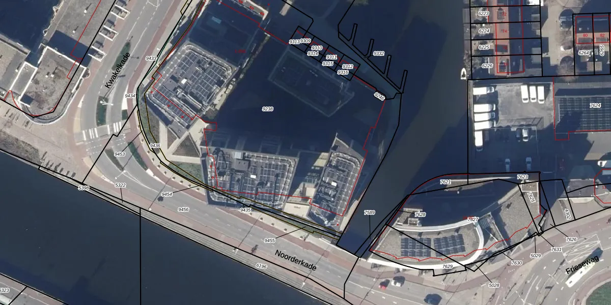 Het perceel waarop Noorderkade 5-E staat heeft een oppervlakte van 4333 m². Dit is een zeer groot perceel. De perceeloppervlakte wordt geregistreerd door het Kadaster. Gedetailleerde informatie over de maten van dit perceel kunt u vinden in het rapport Kadastrale kaart met maatvoering van Noorderkade 5-E.