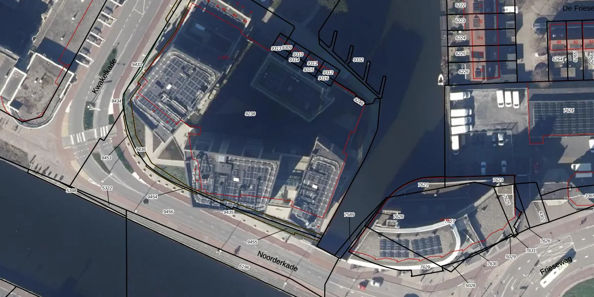 Het perceel waarop Noorderkade 6-F staat heeft een oppervlakte van 4333 m². Dit is een zeer groot perceel. De perceeloppervlakte wordt geregistreerd door het Kadaster. Gedetailleerde informatie over de maten van dit perceel kunt u vinden in het rapport Kadastrale kaart met maatvoering van Noorderkade 6-F.