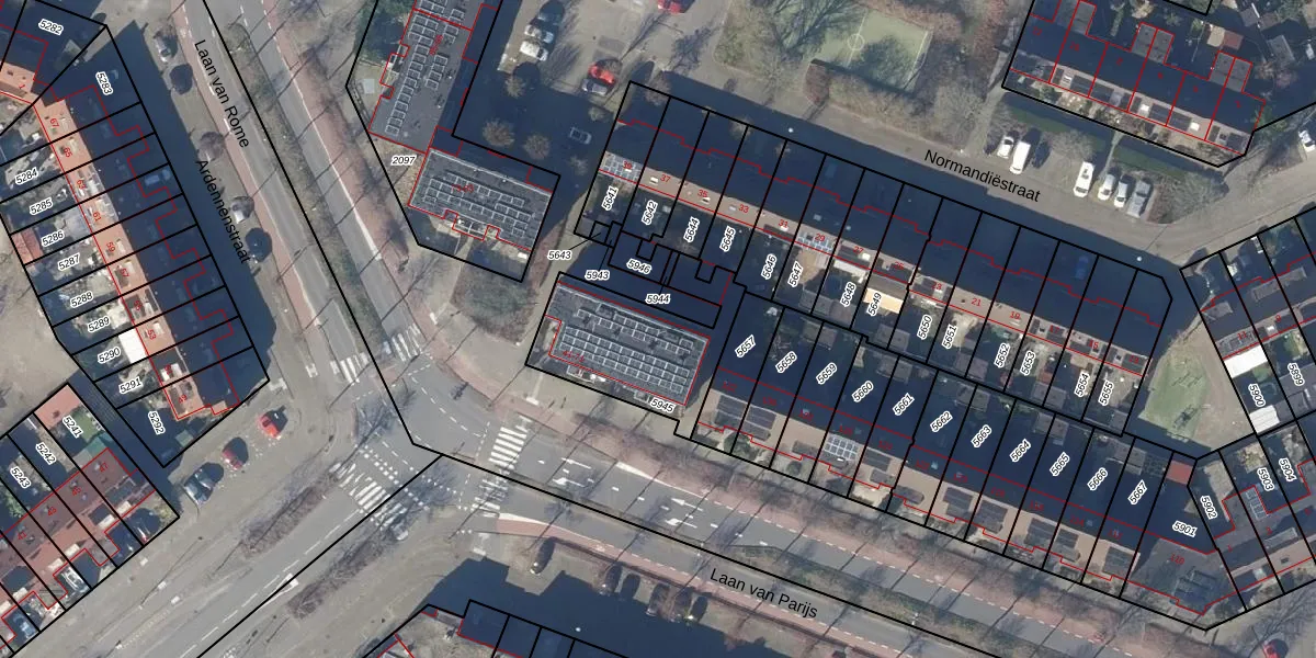 Het perceel waarop Normandiëstraat 43 staat heeft een oppervlakte van 477 m². Dit is een groot perceel. De perceeloppervlakte wordt geregistreerd door het Kadaster. Gedetailleerde informatie over de maten van dit perceel kunt u vinden in het rapport Kadastrale kaart met maatvoering van Normandiëstraat 43.