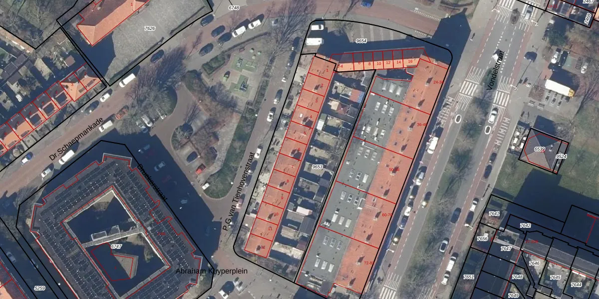 Het perceel waarop P.G.van Tienhovenstraat 6 staat heeft een oppervlakte van 1740 m². Dit is een zeer groot perceel. De perceeloppervlakte wordt geregistreerd door het Kadaster. Gedetailleerde informatie over de maten van dit perceel kunt u vinden in het rapport Kadastrale kaart met maatvoering van P.G.van Tienhovenstraat 6.