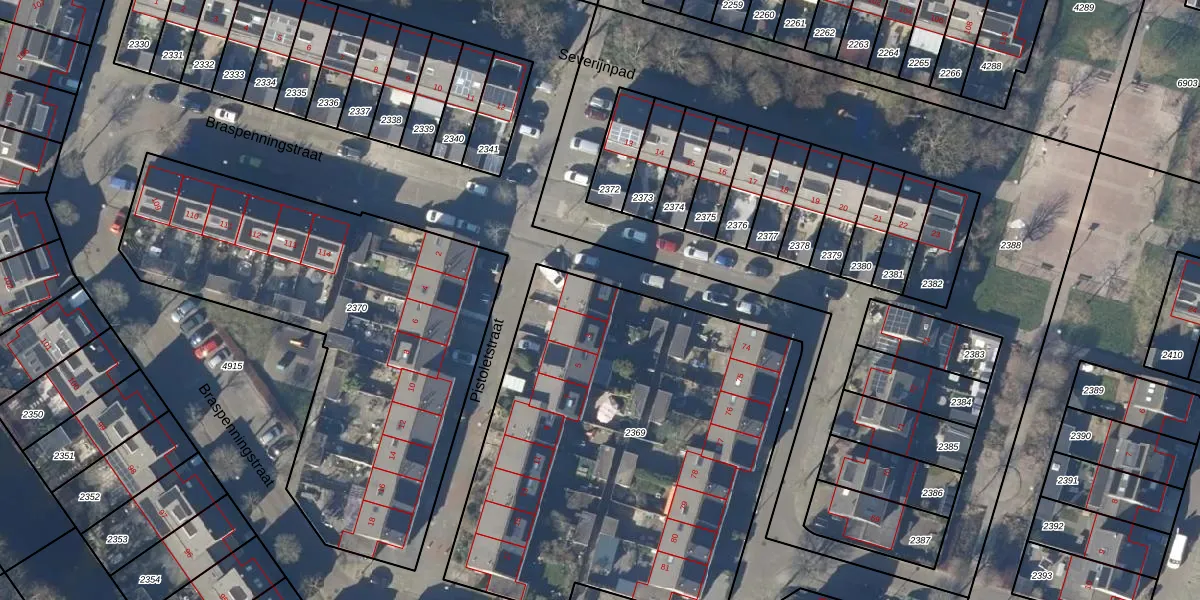 Het perceel waarop Pistoletstraat 1 staat heeft een oppervlakte van 2408 m². Dit is een zeer groot perceel. De perceeloppervlakte wordt geregistreerd door het Kadaster. Gedetailleerde informatie over de maten van dit perceel kunt u vinden in het rapport Kadastrale kaart met maatvoering van Pistoletstraat 1.