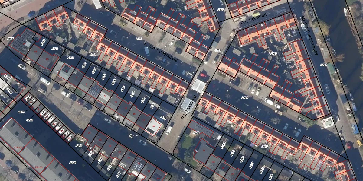 Het perceel waarop P.L.Takstraat 12 staat heeft een oppervlakte van 1565 m². Dit is een zeer groot perceel. De perceeloppervlakte wordt geregistreerd door het Kadaster. Gedetailleerde informatie over de maten van dit perceel kunt u vinden in het rapport Kadastrale kaart met maatvoering van P.L.Takstraat 12.