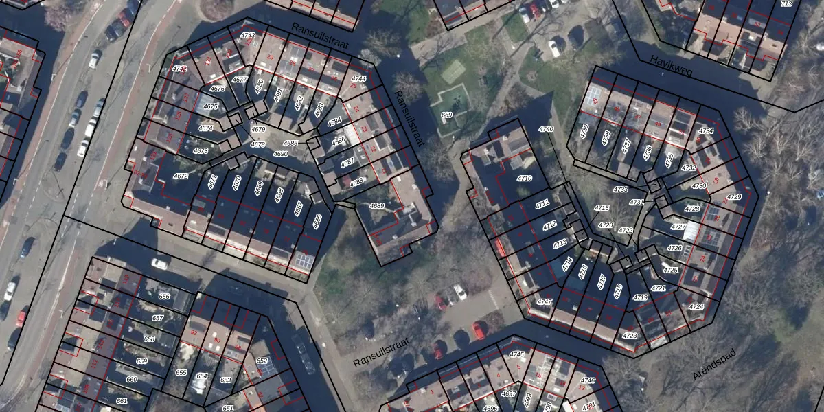 Het perceel waarop Ransuilstraat 19 staat heeft een oppervlakte van 308 m². Dit is een groot perceel. De perceeloppervlakte wordt geregistreerd door het Kadaster. Gedetailleerde informatie over de maten van dit perceel kunt u vinden in het rapport Kadastrale kaart met maatvoering van Ransuilstraat 19.