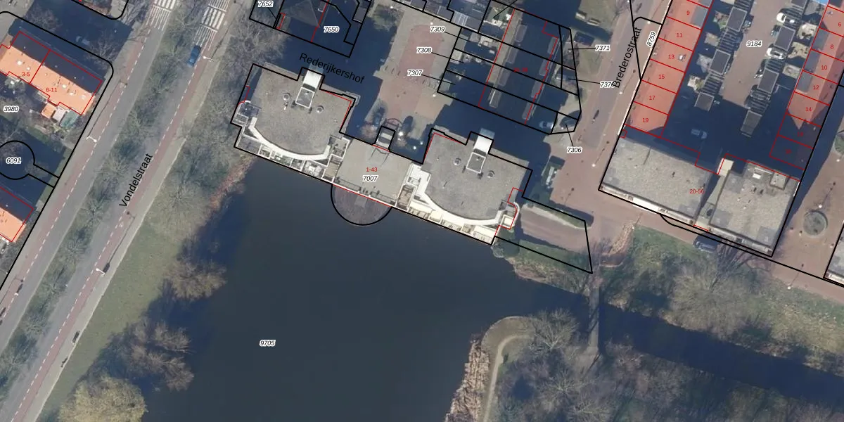 Het perceel waarop Rederijkershof 21 staat heeft een oppervlakte van 1630 m². Dit is een zeer groot perceel. De perceeloppervlakte wordt geregistreerd door het Kadaster. Gedetailleerde informatie over de maten van dit perceel kunt u vinden in het rapport Kadastrale kaart met maatvoering van Rederijkershof 21.