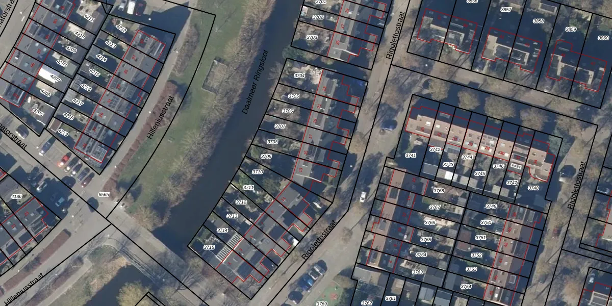 Het perceel waarop Rigolettostraat 15 staat heeft een oppervlakte van 165 m². Dit is een middelgroot perceel. De perceeloppervlakte wordt geregistreerd door het Kadaster. Gedetailleerde informatie over de maten van dit perceel kunt u vinden in het rapport Kadastrale kaart met maatvoering van Rigolettostraat 15.