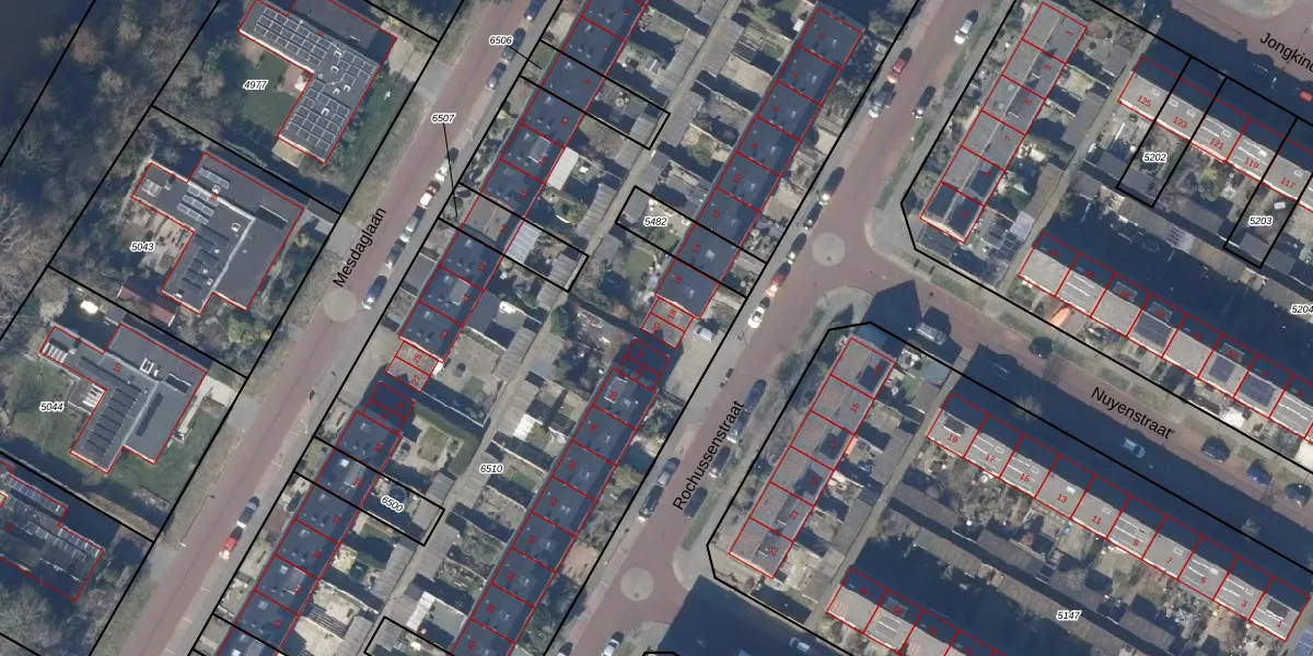 Het perceel waarop Rochussenstraat 20 staat heeft een oppervlakte van 7634 m². Dit is een zeer groot perceel. De perceeloppervlakte wordt geregistreerd door het Kadaster. Gedetailleerde informatie over de maten van dit perceel kunt u vinden in het rapport Kadastrale kaart met maatvoering van Rochussenstraat 20.