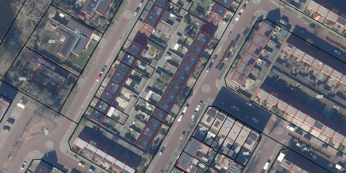 Het perceel waarop Rochussenstraat 36 staat heeft een oppervlakte van 7634 m². Dit is een zeer groot perceel. De perceeloppervlakte wordt geregistreerd door het Kadaster. Gedetailleerde informatie over de maten van dit perceel kunt u vinden in het rapport Kadastrale kaart met maatvoering van Rochussenstraat 36.