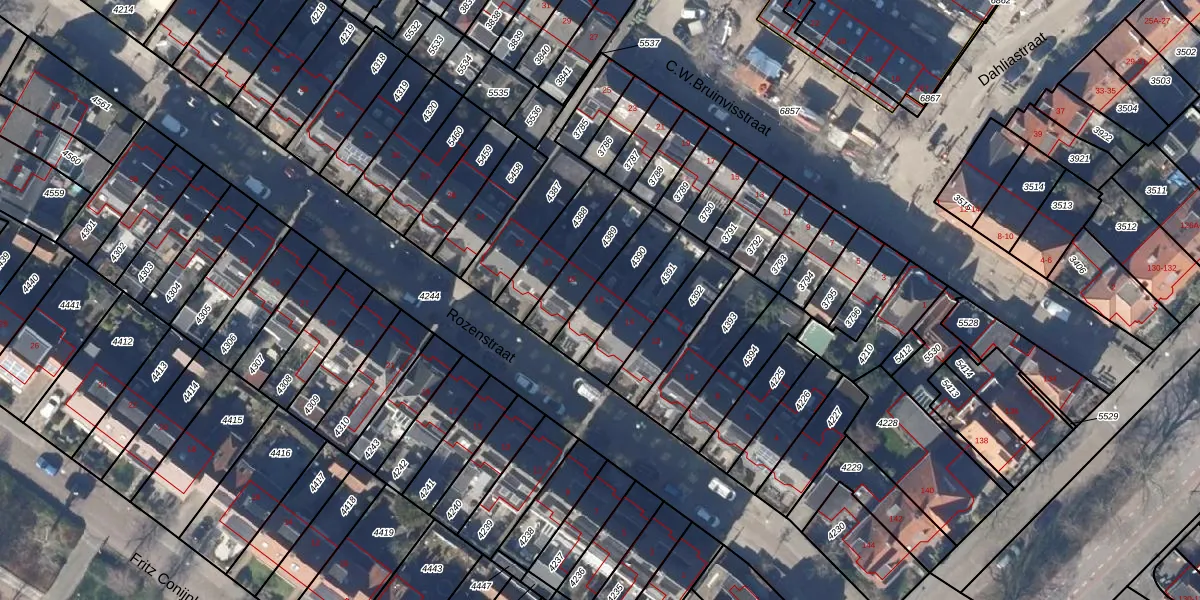 Het perceel waarop Rozenstraat 16 staat heeft een oppervlakte van 166 m². Dit is een middelgroot perceel. De perceeloppervlakte wordt geregistreerd door het Kadaster. Gedetailleerde informatie over de maten van dit perceel kunt u vinden in het rapport Kadastrale kaart met maatvoering van Rozenstraat 16.