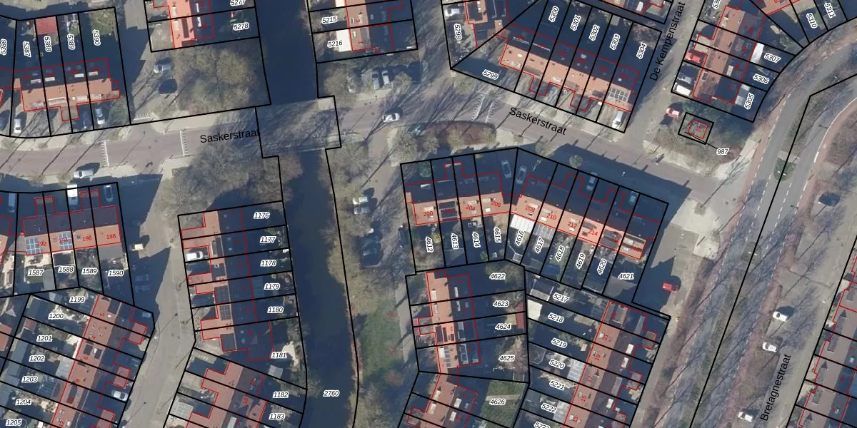 Het perceel waarop Saskerstraat 200 staat heeft een oppervlakte van 179 m². Dit is een middelgroot perceel. De perceeloppervlakte wordt geregistreerd door het Kadaster. Gedetailleerde informatie over de maten van dit perceel kunt u vinden in het rapport Kadastrale kaart met maatvoering van Saskerstraat 200.