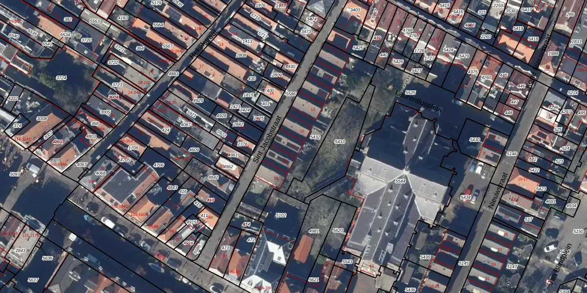 Het perceel waarop Sint Jacobstraat 17 staat heeft een oppervlakte van 938 m². Dit is een groot perceel. De perceeloppervlakte wordt geregistreerd door het Kadaster. Gedetailleerde informatie over de maten van dit perceel kunt u vinden in het rapport Kadastrale kaart met maatvoering van Sint Jacobstraat 17.