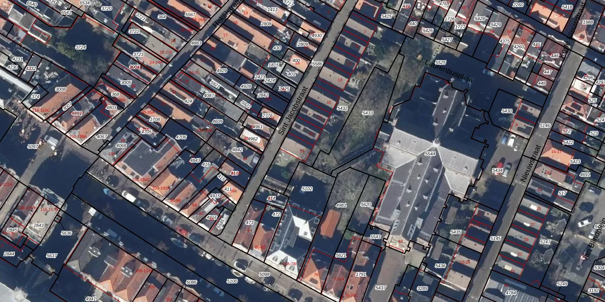 Het perceel waarop Sint Jacobstraat 21 staat heeft een oppervlakte van 938 m². Dit is een groot perceel. De perceeloppervlakte wordt geregistreerd door het Kadaster. Gedetailleerde informatie over de maten van dit perceel kunt u vinden in het rapport Kadastrale kaart met maatvoering van Sint Jacobstraat 21.