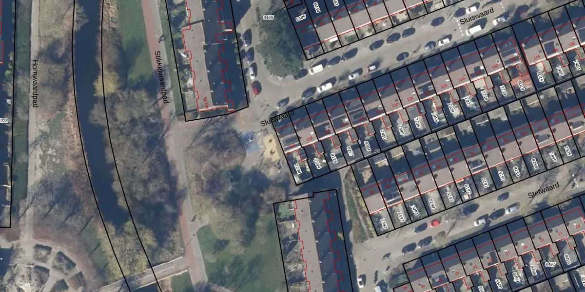 Het perceel waarop Sluiswaard 106 staat heeft een oppervlakte van 159 m². Dit is een middelgroot perceel. De perceeloppervlakte wordt geregistreerd door het Kadaster. Gedetailleerde informatie over de maten van dit perceel kunt u vinden in het rapport Kadastrale kaart met maatvoering van Sluiswaard 106.