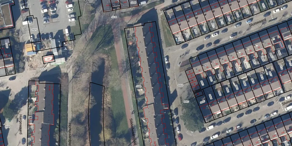 Het perceel waarop Sluiswaard 90 staat heeft een oppervlakte van 1904 m². Dit is een zeer groot perceel. De perceeloppervlakte wordt geregistreerd door het Kadaster. Gedetailleerde informatie over de maten van dit perceel kunt u vinden in het rapport Kadastrale kaart met maatvoering van Sluiswaard 90.