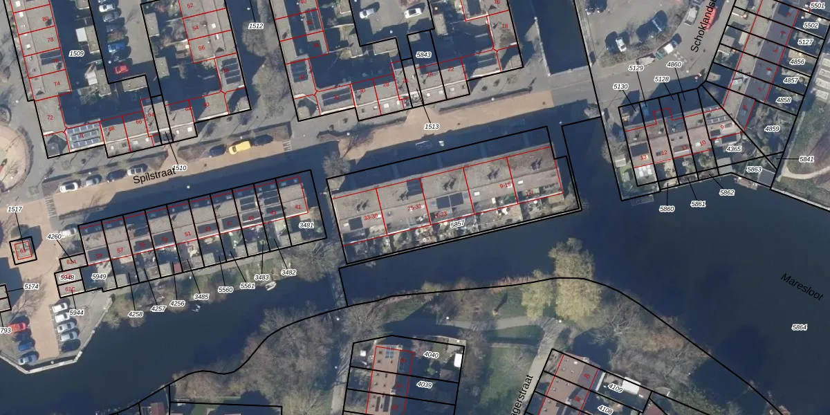 Het perceel waarop Spilstraat 25 staat heeft een oppervlakte van 1185 m². Dit is een zeer groot perceel. De perceeloppervlakte wordt geregistreerd door het Kadaster. Gedetailleerde informatie over de maten van dit perceel kunt u vinden in het rapport Kadastrale kaart met maatvoering van Spilstraat 25.