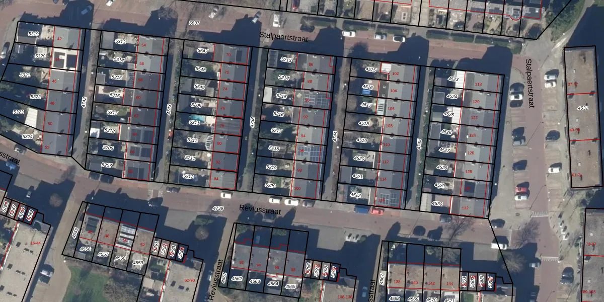 Het perceel waarop Stalpaertstraat 96 staat heeft een oppervlakte van 136 m². Dit is een middelgroot perceel. De perceeloppervlakte wordt geregistreerd door het Kadaster. Gedetailleerde informatie over de maten van dit perceel kunt u vinden in het rapport Kadastrale kaart met maatvoering van Stalpaertstraat 96.