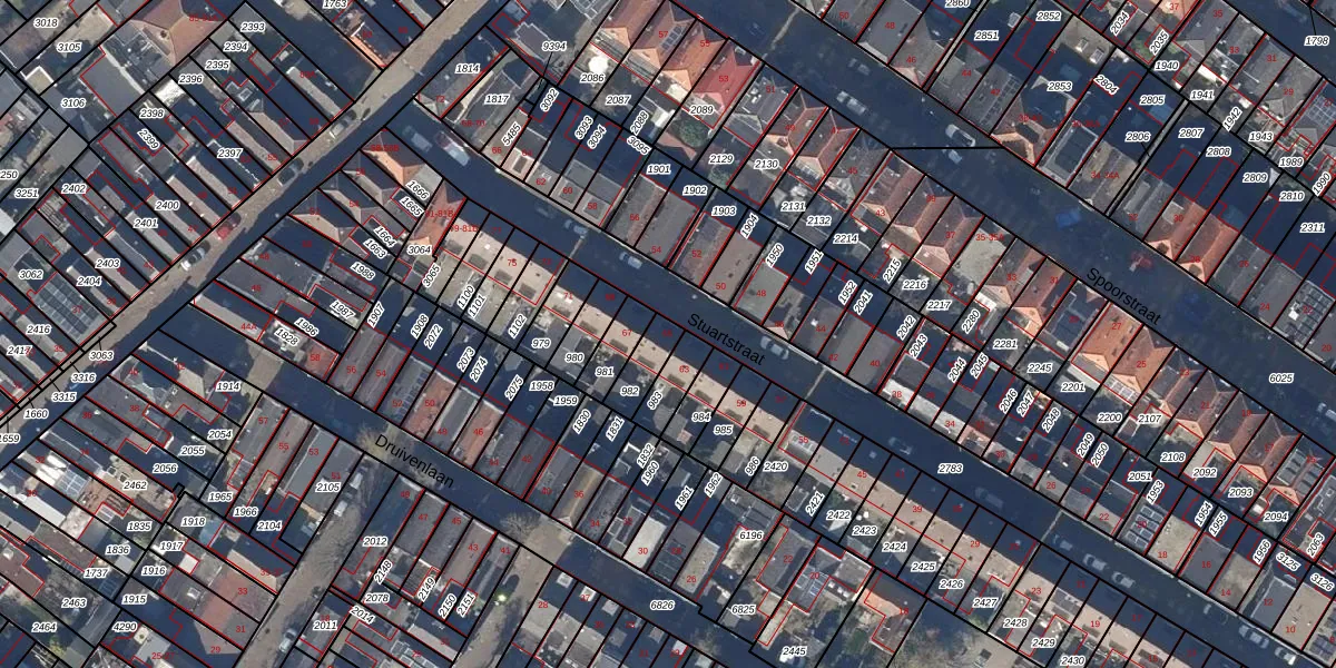 Het perceel waarop Stuartstraat 65 staat heeft een oppervlakte van 78 m². Dit is een klein perceel. De perceeloppervlakte wordt geregistreerd door het Kadaster. Gedetailleerde informatie over de maten van dit perceel kunt u vinden in het rapport Kadastrale kaart met maatvoering van Stuartstraat 65.
