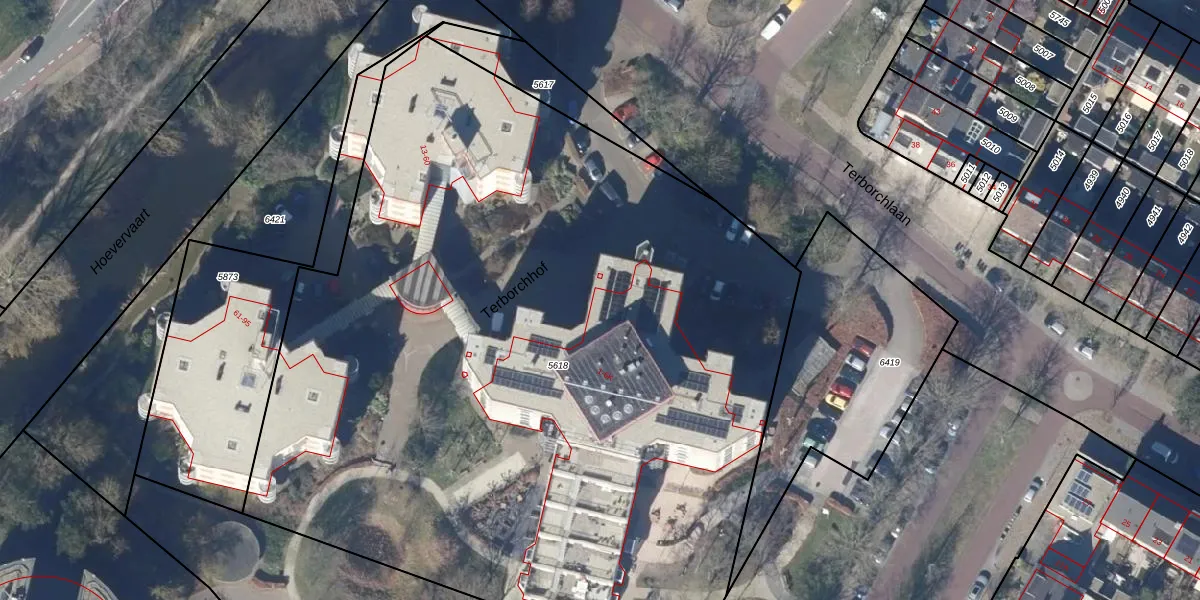 Het perceel waarop Terborchhof 1-A staat heeft een oppervlakte van 6202 m². Dit is een zeer groot perceel. De perceeloppervlakte wordt geregistreerd door het Kadaster. Gedetailleerde informatie over de maten van dit perceel kunt u vinden in het rapport Kadastrale kaart met maatvoering van Terborchhof 1-A.