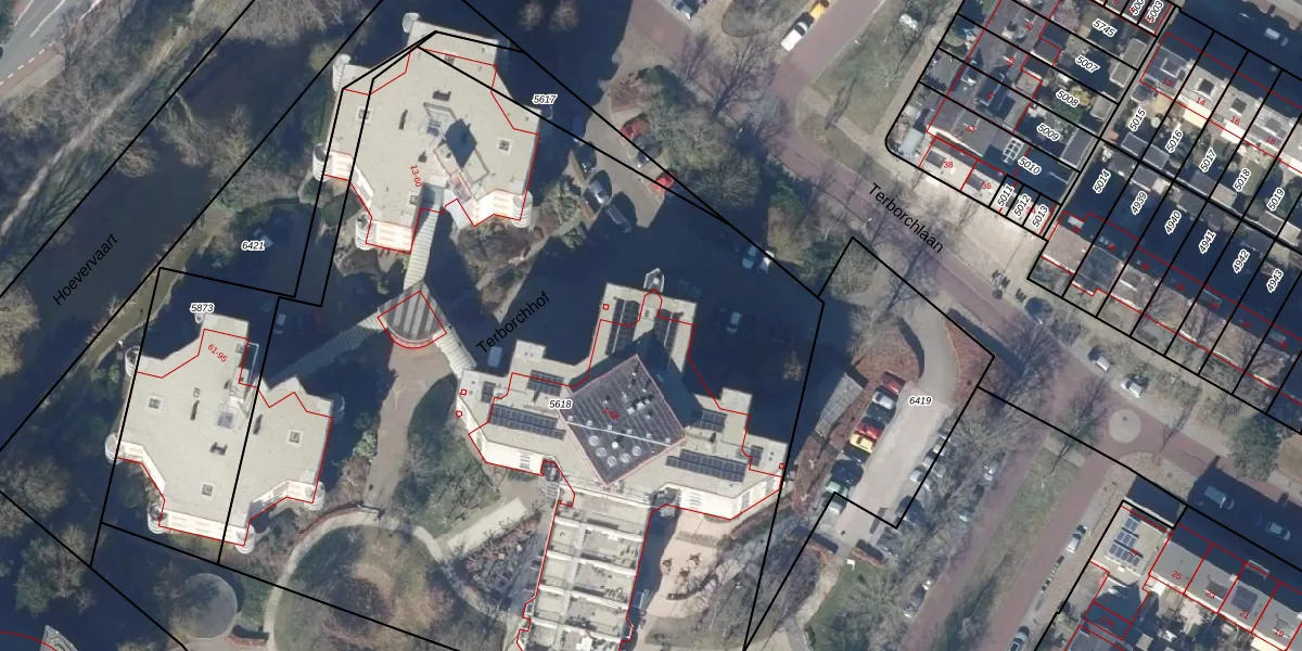 Het perceel waarop Terborchhof 6-B staat heeft een oppervlakte van 6202 m². Dit is een zeer groot perceel. De perceeloppervlakte wordt geregistreerd door het Kadaster. Gedetailleerde informatie over de maten van dit perceel kunt u vinden in het rapport Kadastrale kaart met maatvoering van Terborchhof 6-B.