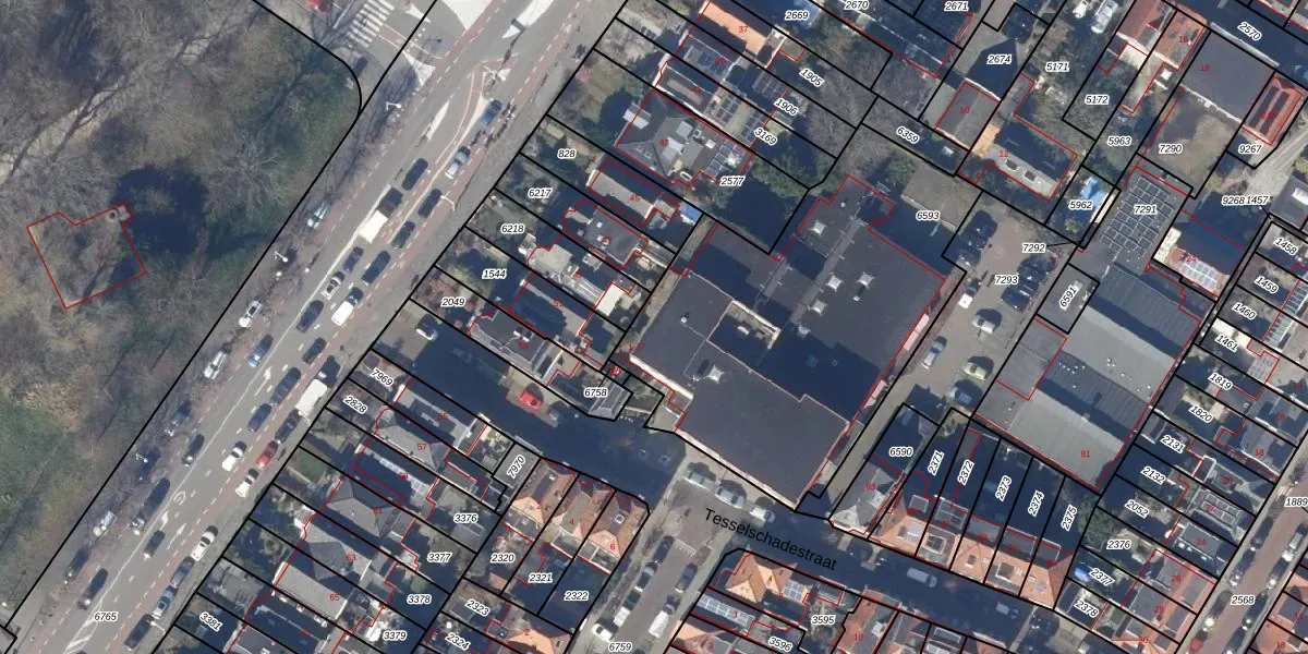 Het perceel waarop Tesselschadestraat 17 staat heeft een oppervlakte van 1765 m². Dit is een zeer groot perceel. De perceeloppervlakte wordt geregistreerd door het Kadaster. Gedetailleerde informatie over de maten van dit perceel kunt u vinden in het rapport Kadastrale kaart met maatvoering van Tesselschadestraat 17.
