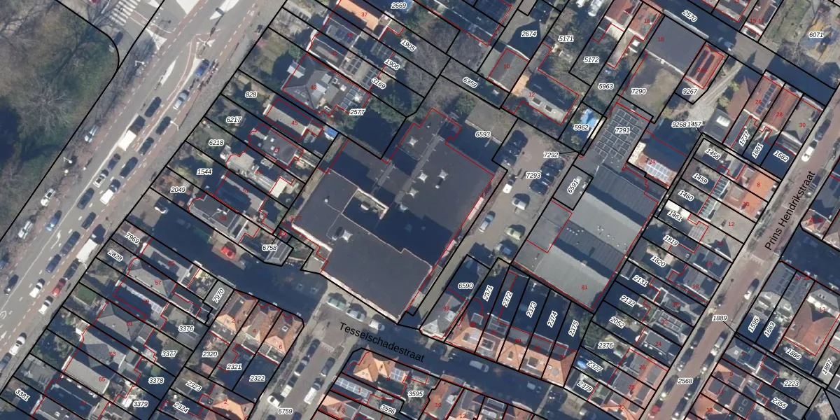 Het perceel waarop Tesselschadestraat 59 staat heeft een oppervlakte van 1765 m². Dit is een zeer groot perceel. De perceeloppervlakte wordt geregistreerd door het Kadaster. Gedetailleerde informatie over de maten van dit perceel kunt u vinden in het rapport Kadastrale kaart met maatvoering van Tesselschadestraat 59.