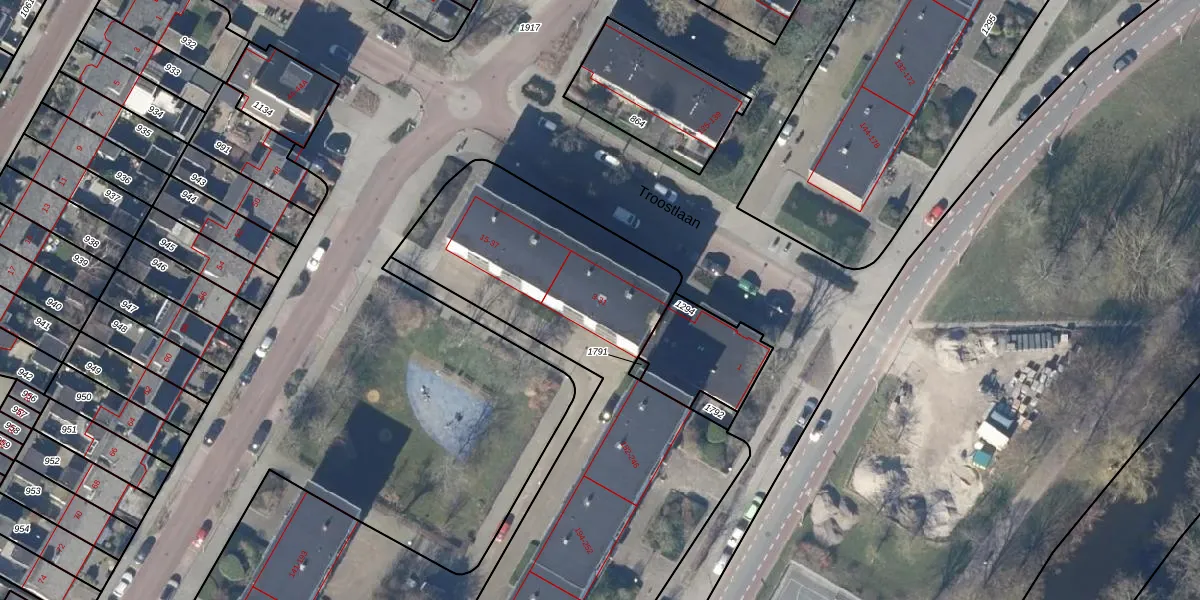 Het perceel waarop Troostlaan 9 staat heeft een oppervlakte van 3538 m². Dit is een zeer groot perceel. De perceeloppervlakte wordt geregistreerd door het Kadaster. Gedetailleerde informatie over de maten van dit perceel kunt u vinden in het rapport Kadastrale kaart met maatvoering van Troostlaan 9.